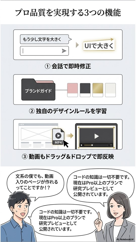 - デザインの知識ゼロでも、会話だけでプロ級のWebページが作れる