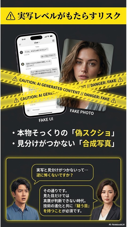 「見た目だけでは本物か偽物かわからない時代」が来ています。AIの進化と、フェイク画像のリスクは常にセットで上がっています。技術の進化を喜ぶだけでなく、「疑う目」を持つことも同じくらい大切です。