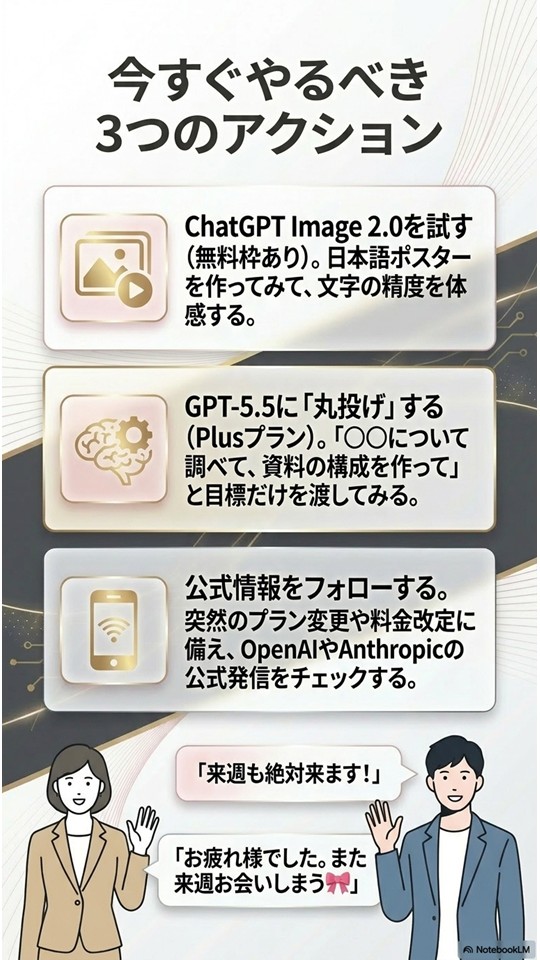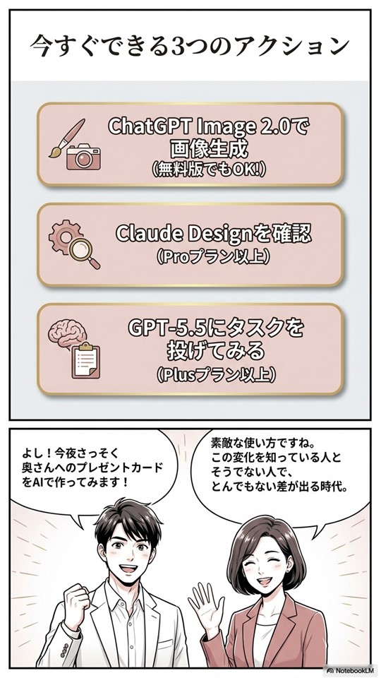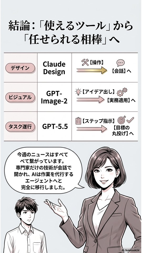 Claude Designは「デザインの知識がなくてもアイデアを形にできる相棒」になりました。GPT-Image-2は「広告やSNS投稿の画像を一緒に作ってくれる相棒」になりました。GPT-5.5は「目標を渡せば全部やってくれる、頼りになる相棒」になりました。