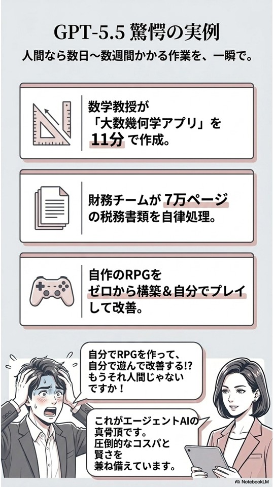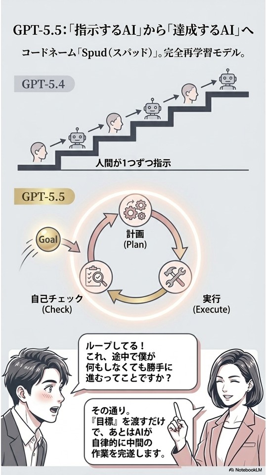 GPT-5.5では、これが変わります。「この目標を達成して」と渡すだけで、AIが自分でやることを決めて、ツールを選んで、実行して、「これで良かったっけ?」と自己チェックして、また次に進む…というループを勝手に回し続けてくれます。