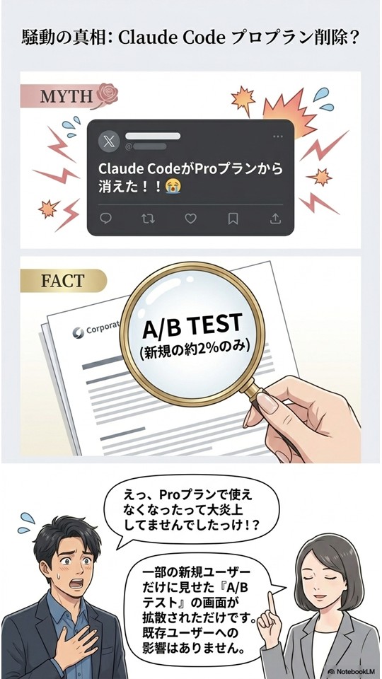 対象になっていたのは新規契約者のたった**2%**だけ。既存のProユーザーへの影響は一切なく、翌日には料金ページが元に戻り「Claude Codeが含まれます」という表示が復活しました。