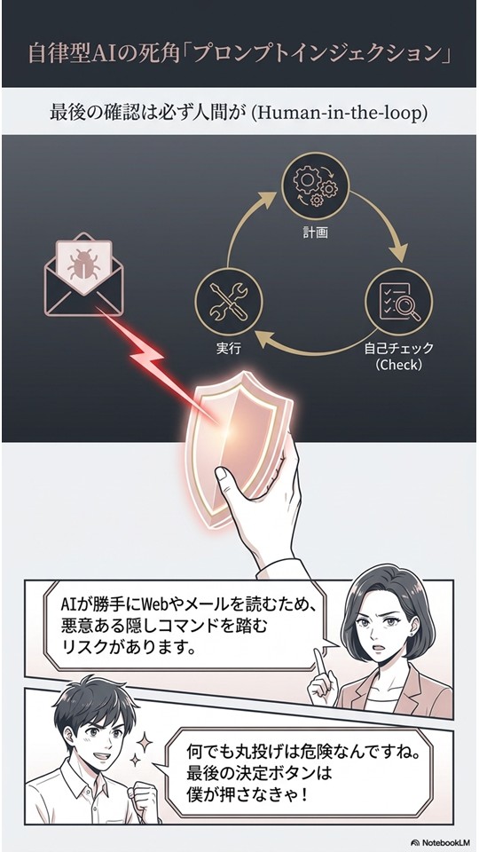 GPT-5.5はメールやWebページを自立的に読んで行動します。しかし、読み込んだページの中にAIへの「こっそり命令」が仕込まれている場合があります。それに引っかかると、意図しない動作をする可能性があります。