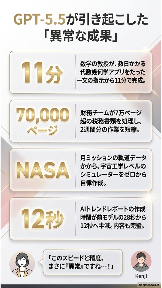7万ページの税務書類を短縮処理 ある企業の財務チームが、2万4千件以上・合計7万ページを超える税務書類の処理にGPT-5.5を活用して、2週間分の作業を短縮しました。