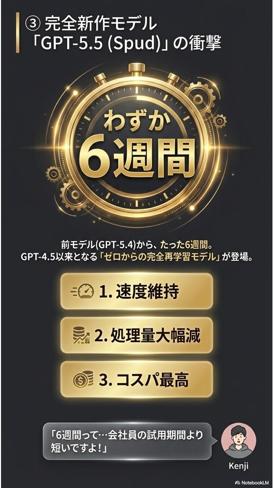 GPT-4.5以来初めてモデルを0から作り直した完全新作で、前モデルのGPT-5.4からわずか6週間でリリースされました。AI開発の競争がいかに加速しているかを示す数字です。