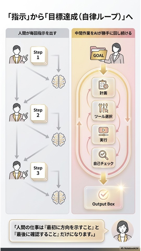 一言でいうと、「指示するAIから、目標を達成するAIへの進化」です。